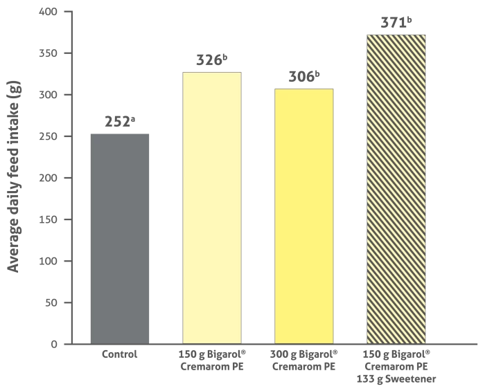 En los tres grupos de tratamiento se produjo un aumento significativo tanto de la ingesta media diaria de pienso como de la ganancia media diaria de los lechones en comparación con los alimentados con la dieta de control. A pesar del notable aumento de la ingesta de pienso observado con una tasa de aplicación de 150 g de Bigarol® Cremarom PE por tonelada de pienso, la adición de un edulcorante produjo un notable aumento del 47 % en comparación con el grupo de control, lo que se tradujo en un aumento de peso aún mayor entre los lechones.