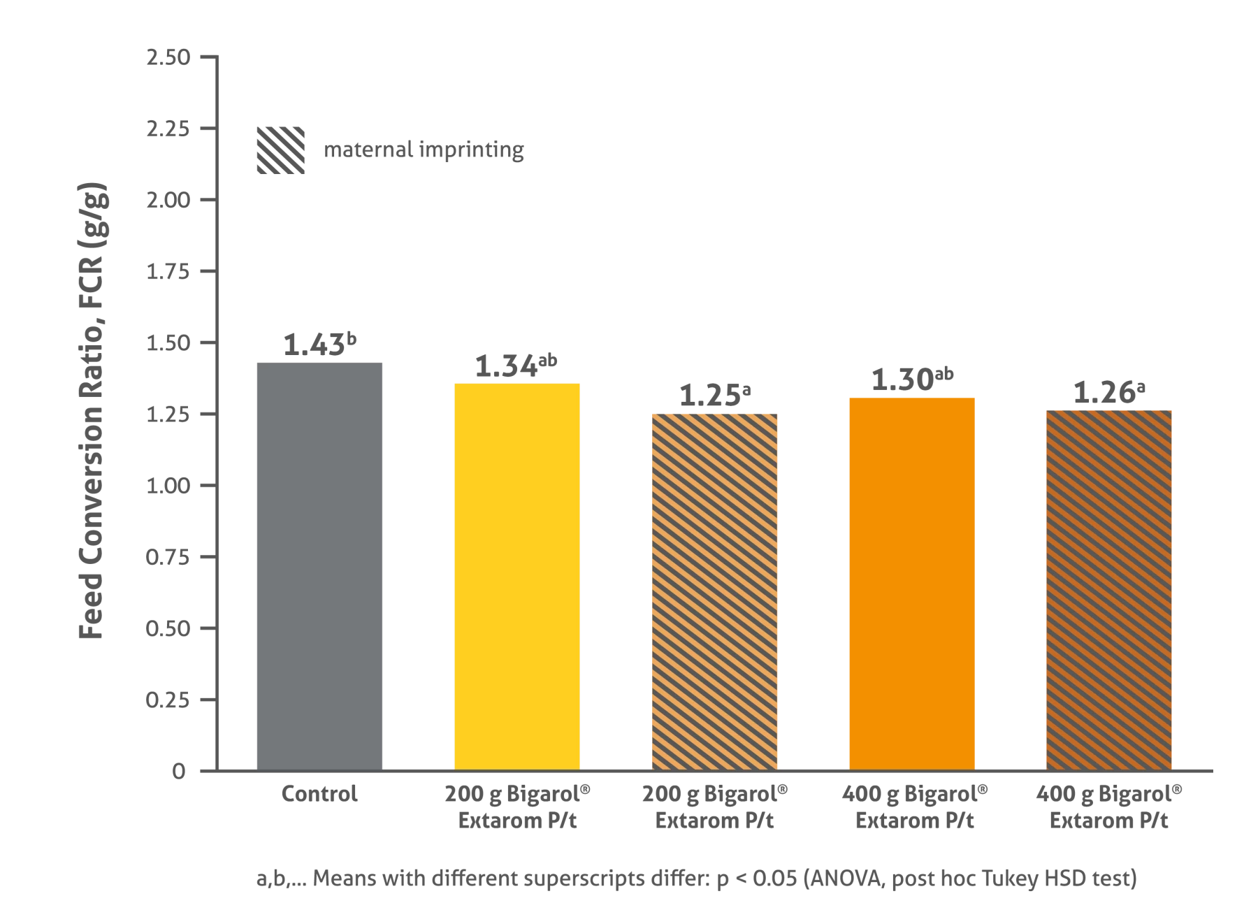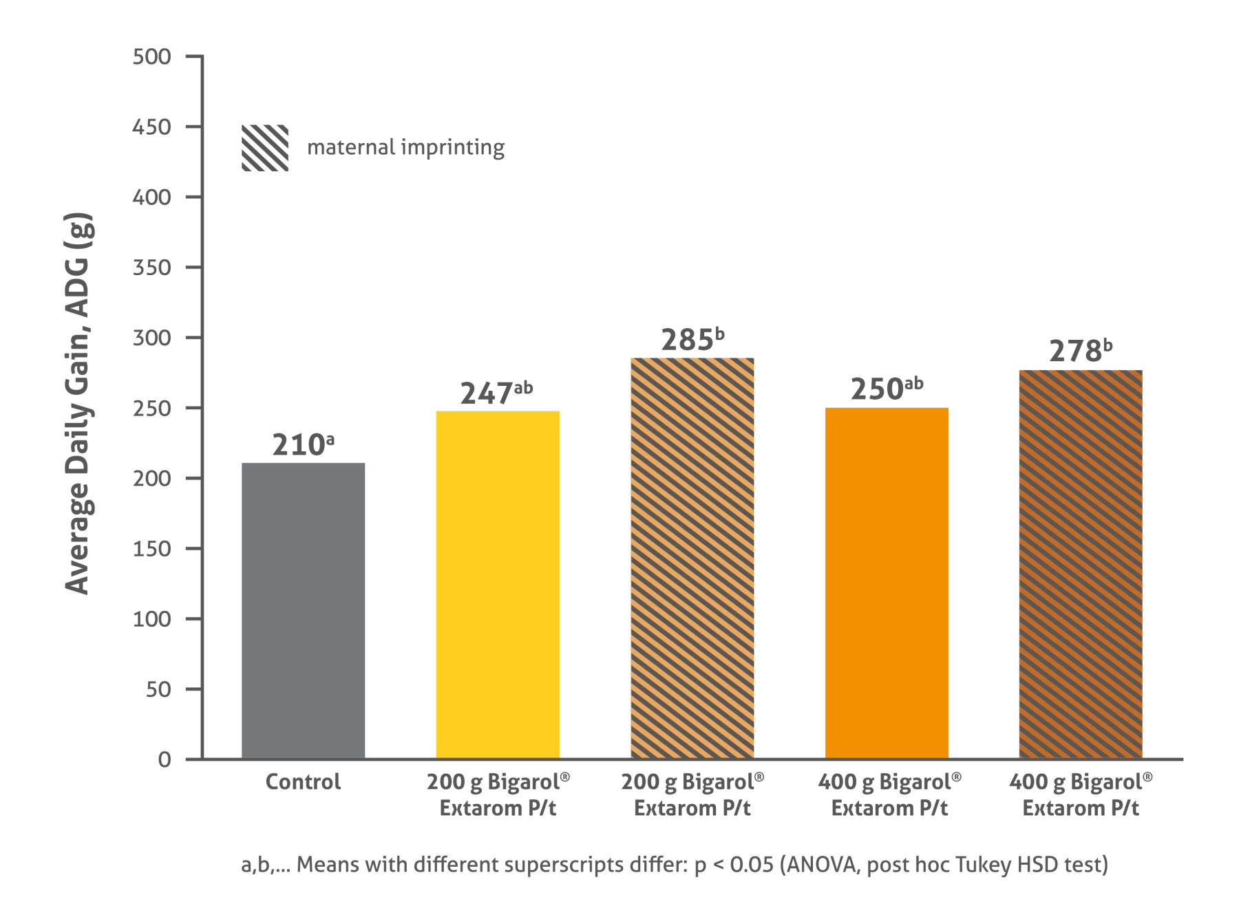 Los resultados del ensayo demuestran claramente los beneficios de la aplicación de aroma Bigarol® Extarom P, especialmente cuando se combina con la imprinting materno.