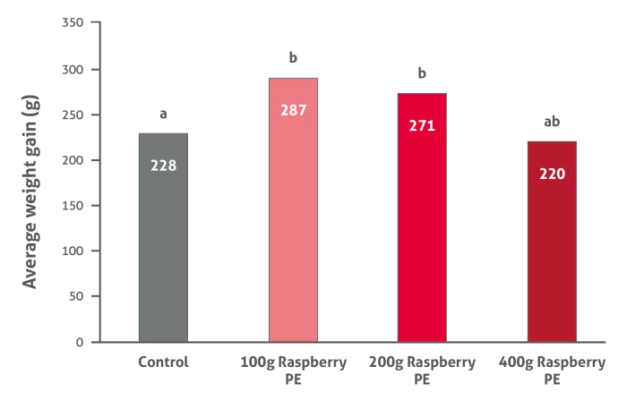 - Tratamento 2: 100 g de Bigarol Raspberry P por tonelada de ração;