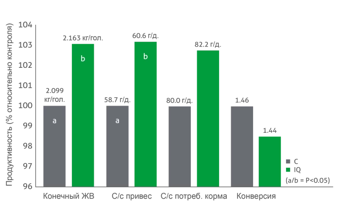 Известно, что IQ положительно влияют на различные стрессовые ситуации, такие как транспортировка, тепловой стресс или роды, обеспечивая улучшение продуктивности в сочетании с более низкой экспрессией маркеров воспаления и стресса, эффектом смещения микробиома в сторону более полезных групп бактерий и снижением проницаемости кишечника.