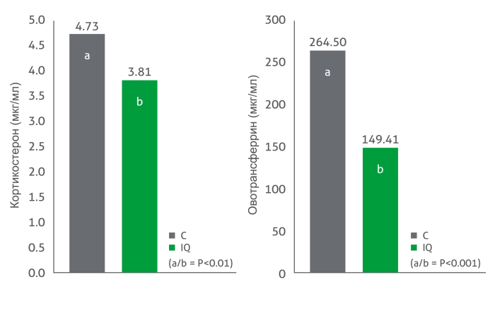 Конечная живая масса на 35-й день и среднесуточный прирост массы тела значительно увеличились в группе, получавшей IQ, по сравнению с контрольной группой (p < 0,05; рисунок 2). Среднесуточное потребление корма и коэффициент конверсии корма улучшились в группах, получавших IQ, но изменения не достигли уровня значимости. Уровни смертности (1 д. – 35 д.) составили 3,65 % (C) и 2,60 % (IQ). Общая эффективность выращивания улучшилась, о чем свидетельствует значительно более высокий Европейский фактор эффективности производства (Рисунок 3). Уровень кортикостерона в сыворотке, измеренный на 28-й день, был значительно снижен в группе, получавшей IQ (p < 0,01), а сывороточный овотрансферрин показал еще более сильное и значимое снижение (p < 0,001) в группе, получавшей IQ, по сравнению с птицами контрольной группы (Рисунок 4).