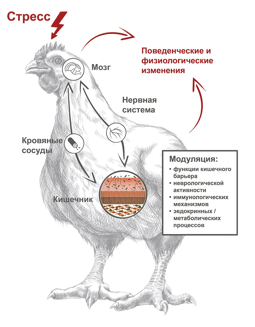 Ключевым аспектом в этом контексте является двунаправленный обмен через ось кишечник-мозг (GBA), что приводит к разным уровням устойчивости к стрессу у животных. В настоящее время предпринимаются усилия, чтобы лучше понять эту тесную связь между процессами в кишечнике и их прямым или косвенным влиянием на другие части тела. GBA можно разделить на различные области, работающие рука об руку. Непосредственно за реакцию на стресс отвечает ось гипоталамус-гипофиз-надпочечники (HPAA). HPAA работает с нейроэндокринными мессенджерами, такими как глюкокортикоиды, из которых кортизол у млекопитающих и кортикостерон у грызунов и птиц являются одними из широко известных молекул. Микробиота-GBA специально фокусируется на роли микробиоты кишечника, которая становится все более важной для модуляции иммунной системы, реакций на стресс, общей генерации нейротрансмиттеров, а также поведения животных. Кроме того, кишечная, центральная и автономная нервная системы, а также иммунная система и эндокринные механизмы коммуникации сами по себе играют важную роль в строгой регуляции GBA (рисунок 1).