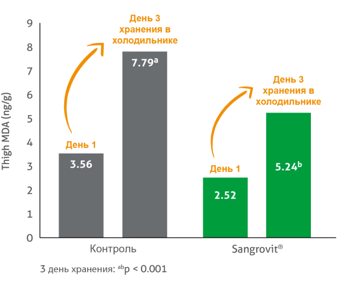 • У птиц, получавших Sangrovit® 3-го поколения, наблюдалось лишь умеренное увеличение МДА.