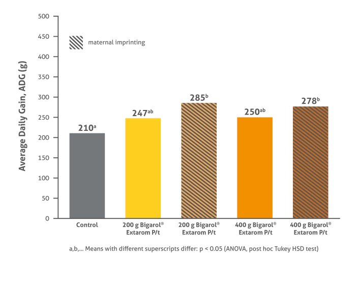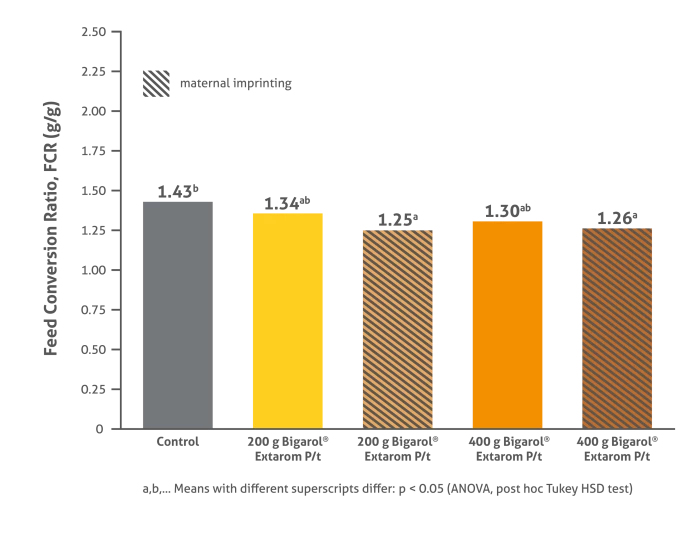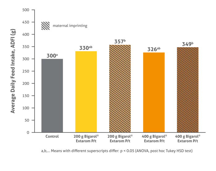 Piglets fed diets supplemented with the flavour Bigarol® Extarom P showed improved performance compared to the control group, especially when maternal imprinting was applied.